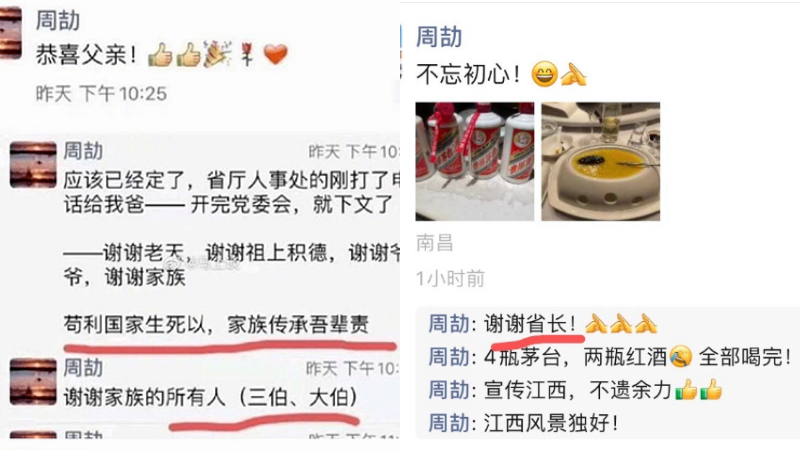 7月25日晚,多个与“江西国企员工炫耀家人有后台”相关的话题登上微博热搜榜。网传的周劼朋友圈截图内容有三个特点:一是炫父,周劼宣称“父亲的副局长没问题了”、“省厅人事处的人刚打了电话给我爸”等。