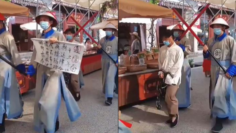 8月19日,网传视频显示,西安街头惊现花式防疫宣传,一群身穿清朝服装的防疫人员,表演把不戴口罩的囚犯游街示众的一幕。