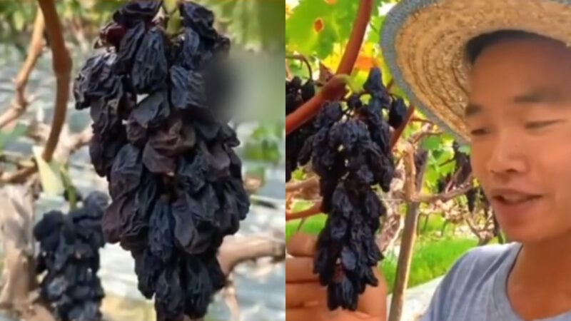 22日,网上传出的一段视频显示,四川南充的一个葡萄园,葡萄在树上直接晒成了葡萄干。
