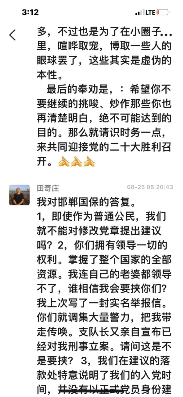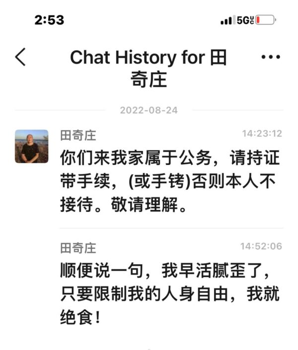 现年69岁的邯郸市退休作家田奇庄8月24日在朋友圈发帖说,“你们(公安)来我家属于公务,请持证带手续(或手铐),否则本人不接待。敬请理解。”“顺便说一句,我早活腻歪了,只要限制我的人身自由,我就绝食!”