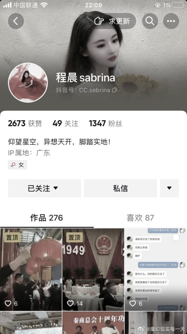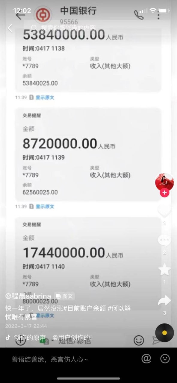 近日大陆抖音平台上一个名为“程晨sabrina”的女性网民引发舆论关注。此人在网上晒出银行账户上千万元人民币的入账或者花销,以及高达8000万的账户余额,还经常炫耀各种奢侈品的照片。