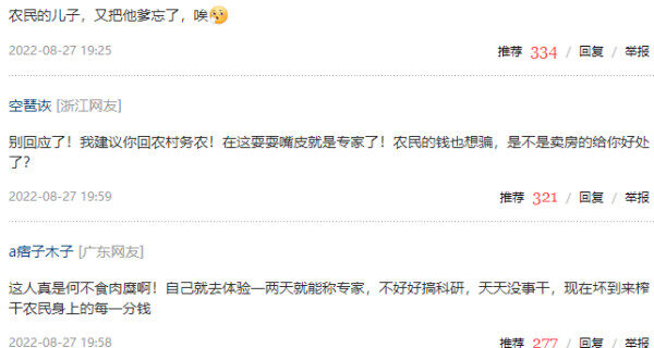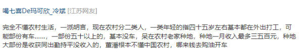 还有一位广东网友留言质问:“我只提简单的几个问题:农民年收入是多少?农民家庭孩子上学、婚丧嫁娶、人情往来需要多少钱?在城里买房需要多少钱?居住城市水电、物业费用需要多少钱?城乡来回跑的费用需要多少钱?随便算一下就还敢吓喷吗!”