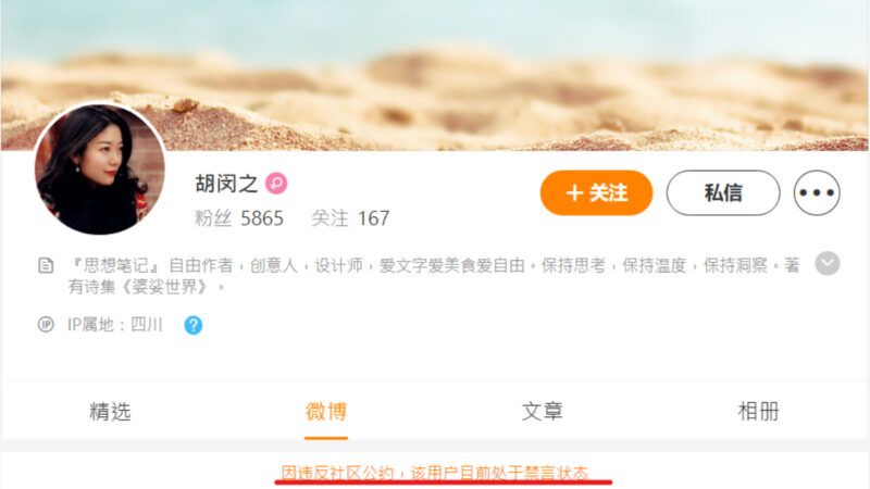 【新!唐!人:北京时间2022年09月05日讯】中共二十大前,大陆独立女作家、诗人胡闵之发表《等风来》的文章在网络上热传,引发大批网民共鸣。随后这篇文章遭到中共全网封杀,胡闵之也遭到约谈,她的微博、微信被封。
