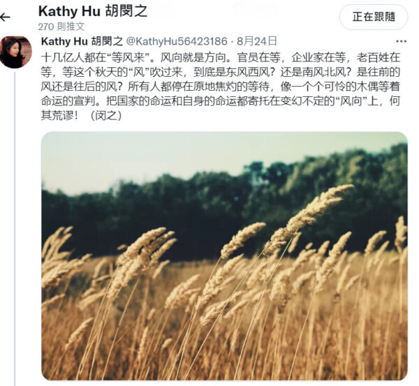 8月24日,胡闵之在其推特上发表了《等风来》的文章,内容是:十几亿人都在“等风来”。风向就是方向。官员在等,企业家在等,老百姓在等,等这个秋天的“风”吹过来,到底是东风西风?还是南风北风?是往前的风还是往后的风?所有人都停在原地焦灼的等待,像一个个可怜的木偶等着命运的宣判。把国家的命运和自身的命运都寄托在变幻不定的“风向”上,何其荒谬!(相关链接)