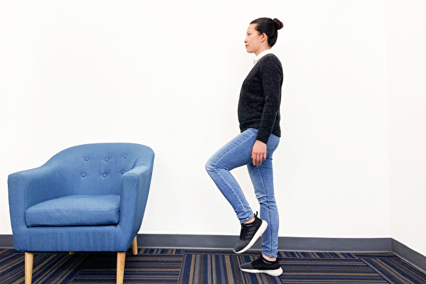 方法二:双手自然垂放身体两侧,双脚轮流抬高约20公分,站立30秒,每天约站15到20分钟。