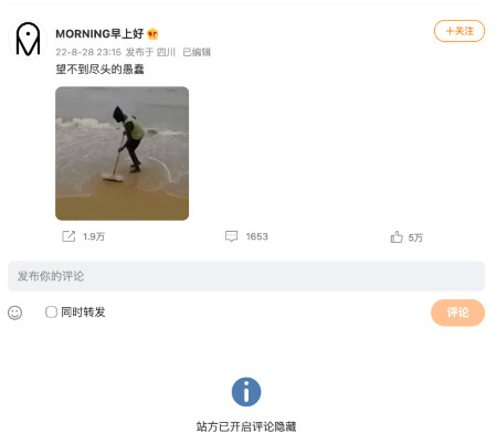微博网民“@MORNING早上好”上传了一张gif图片,图片内容是一人在沙滩上奋力拖地排水,图片配文“望不到尽头的愚蠢”,疑似讽刺防疫清零政策。这条微博被转发1.9万次、获点赞5万次,但于近期被“站方开启评论隐藏”。