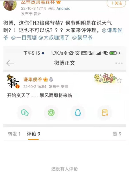 报导举例,微博网民“@谦卑侯爷”发布了一条评论天气的动态“开始变天了……暴风雨即将来临”,或许是担心该微博引发无端的政治联想,这条微博遭到了官方限评,目前已被删除。