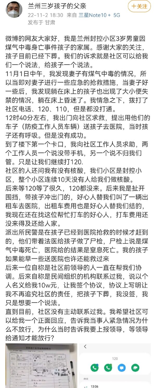【新!唐!人:北京时间2022年11月04日讯】甘肃兰州一名3岁男童因封控延误治疗而死亡事件,再次引发民愤。据报,当时男童父亲打了120急救电话求救,但救护车超过两小时未到,而最近一家医院步行仅需12分钟。最后男童父亲抱着孩子冲出路障,乘搭的士送医。
