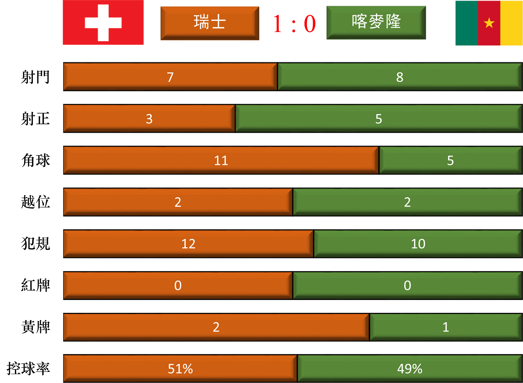 最终全场比赛结束,瑞士队1比0击败喀麦隆队,全取3分。本场比赛,两队可谓旗鼓相当,瑞士队把握住机会取得进球,从而获得胜利。