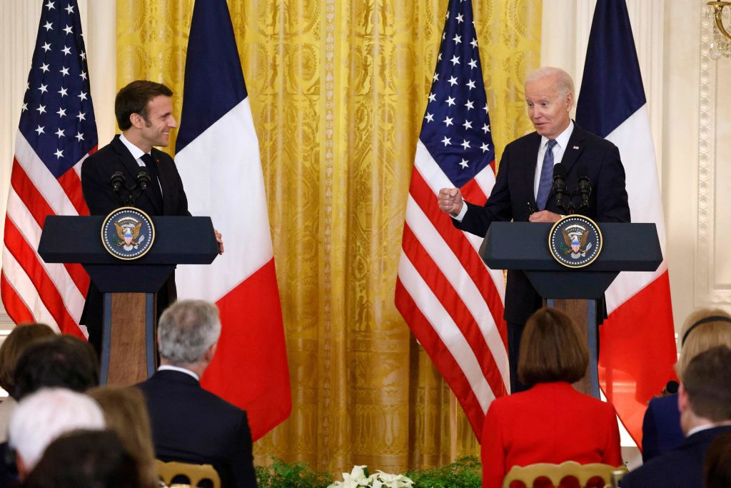 在椭圆形办公室会谈后发表的一份联合声明中,拜登和马克龙表示,他们致力于让俄罗斯对“其正规武装部队及其代理人在乌克兰犯下的有广泛记录的暴行和战争罪行”负责。