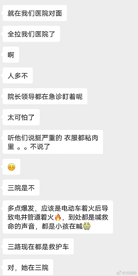 网传微信截图显示,医院知情人士透露,伤者烧的挺严重,衣服都在肉里,起火现场到处听到救命声,有小孩在喊。