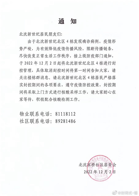 该网友贴出的一则通知显示,西安北沈家桥社区居委会12月2日发布通知,即日起对北沈新世纪北区4栋实施封控管理。