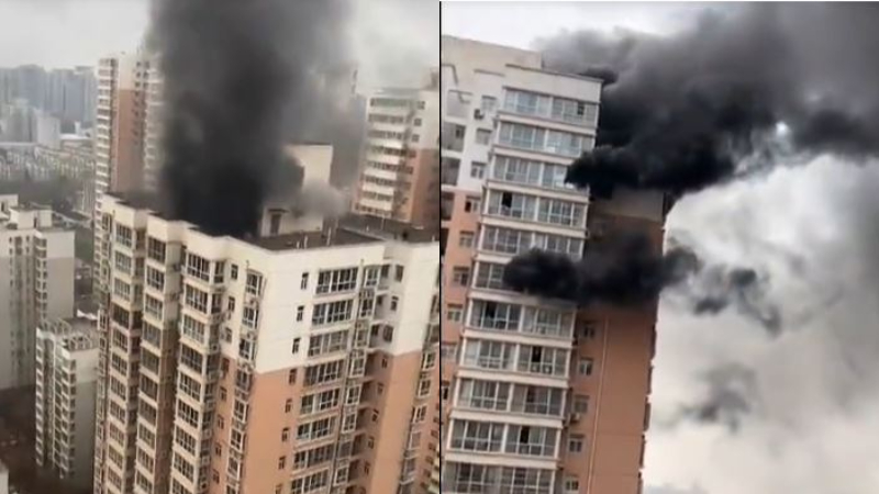 网传视频显示,住宅楼一楼冒出火光,黑黑的浓烟从楼顶冒出,但奇怪的是,其它楼层并未冒出黑烟。