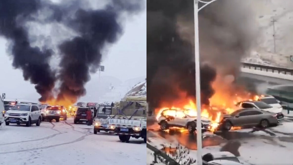 网传的视频显示,路面有积雪,多辆车在路中央相撞,并起火燃烧,火势凶猛,还伴随着黑色浓烟。