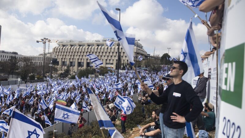 人群聚集在耶路撒冷内塔尼亚胡的私人住宅外,要求停止司法改革。同时点燃篝火,封锁了一条主要公路。