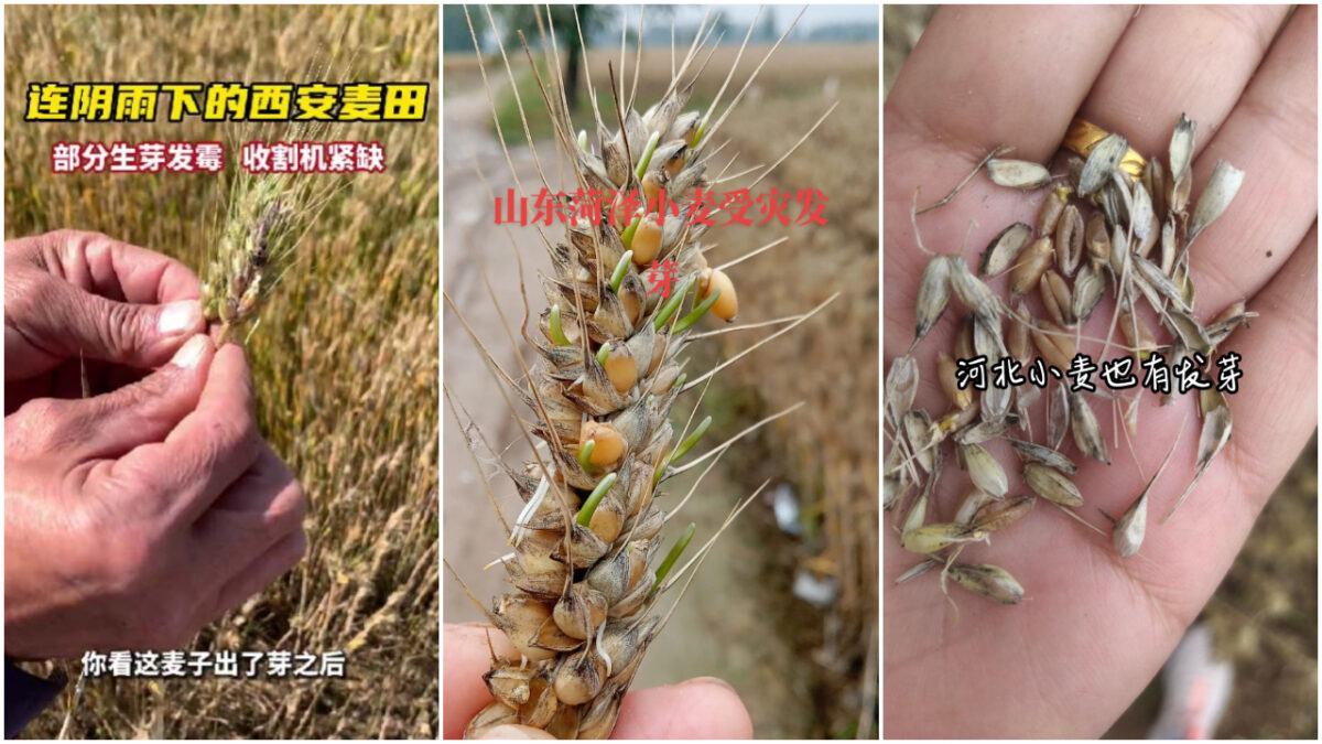 官媒报导,西安市临潼区零口街道冯李村一片200多亩的麦田出现麦穗发黑、麦粒干瘪、发芽的现象。当地农民介绍,这片地往年亩产千余斤,但今年先是遭遇霜冻,现在又遇雨水,不但产量会大减,而且这种发黑的小麦很难再食用,磨成面也会很黏。而且当地雨水还将持续,收割机现在仍然无法下地。