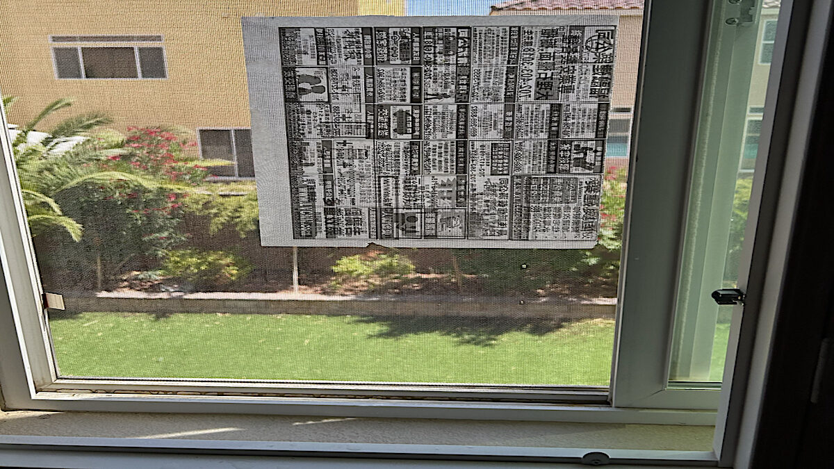 贴到纱窗上的时候,可能有脱落的地方,可以再多洒一点水,边喷水,边压它,让报纸完全吸附在纱窗上,