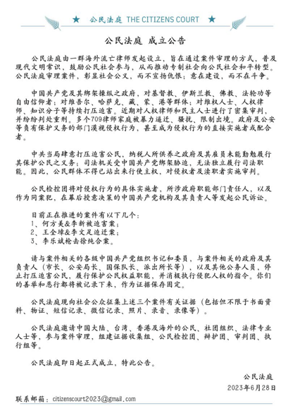 6月28日,“公民法庭”(Citizens Court)透过推特发表成立公告。公告指出,中国共产党及其绑架操纵之政府,对基督教、伊斯兰教、佛教、法轮功等自由信仰者;对维吾尔、哈萨克、藏、蒙、港等群体;对维权人士、人权律师、知识分子等持续打压迫害,近期对人权律师和民主人士进行了密集审判,并纷纷判处重刑;多个709律师家庭被暴力逼迁、骚扰、限制出境。