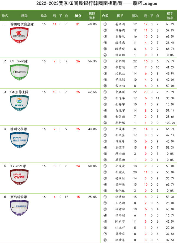 本赛季韩国围棋联赛首次邀请台、日棋手各组建一支队伍,共有12支队伍参赛,成为名副其实的国际围棋联赛。