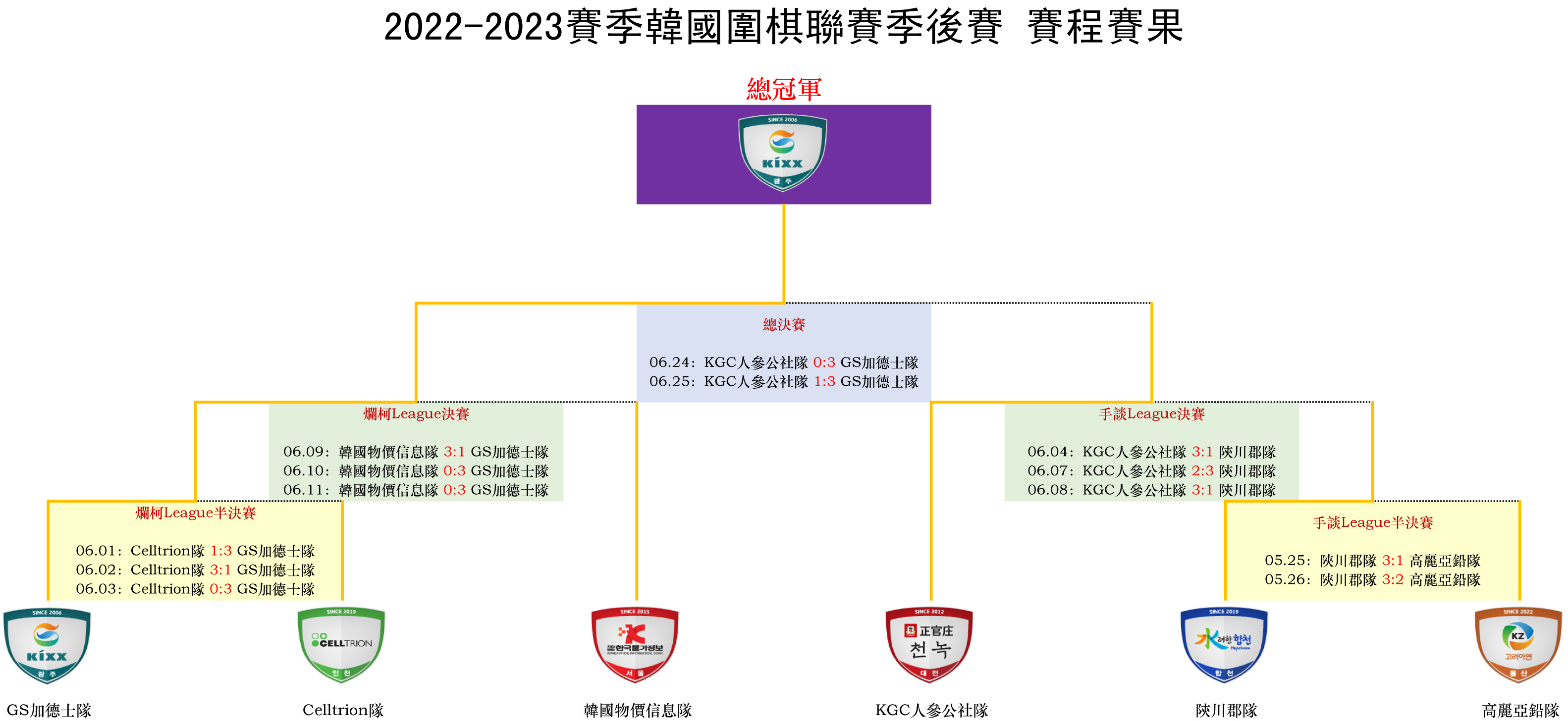 晋级季后赛后,GS加德士队士气大震,常规赛中表现不佳的两位棋手——金昌勋六段和金昇宰九段如有神助,季后赛里均交出四胜二负的成绩单,而棋队的领军人物申真谞九段更是八战全胜,为夺得总冠军立下汗马功劳。