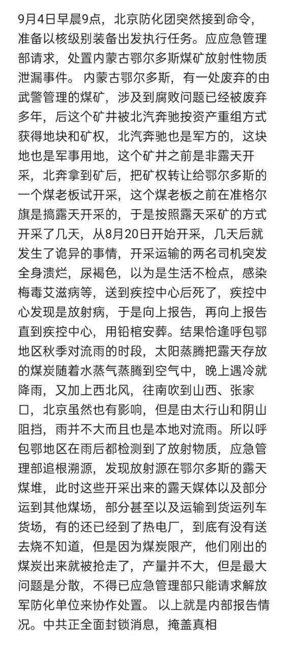 最早的网络消息称,引发核污染的是中共军企北汽奔驰旗下的一处鄂尔多斯含铀煤矿。北汽奔驰将这个本来非露天开采的煤矿转给当地一名煤老板,导致煤矿8月20日左右开始露天开采,结果引发核泄漏,两名运输司机遭辐射死亡,核污染随着煤炭、蒸汽和对流雨大面积扩散。
