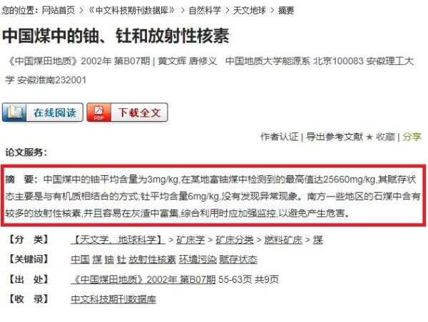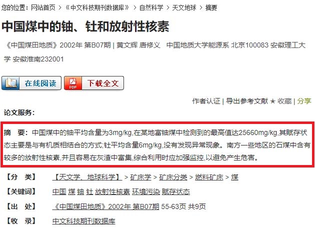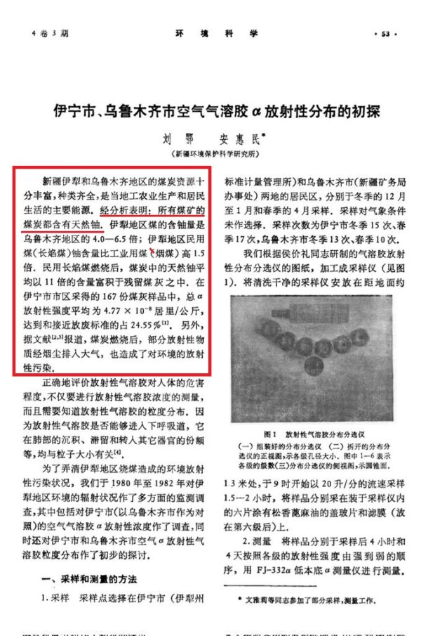 另一篇国内论文指出,新疆伊犁和乌鲁木齐地区煤炭资源丰富,是当地工农业生产和居民生活的主要能源,但当地所有煤矿的煤炭都含有天然铀。