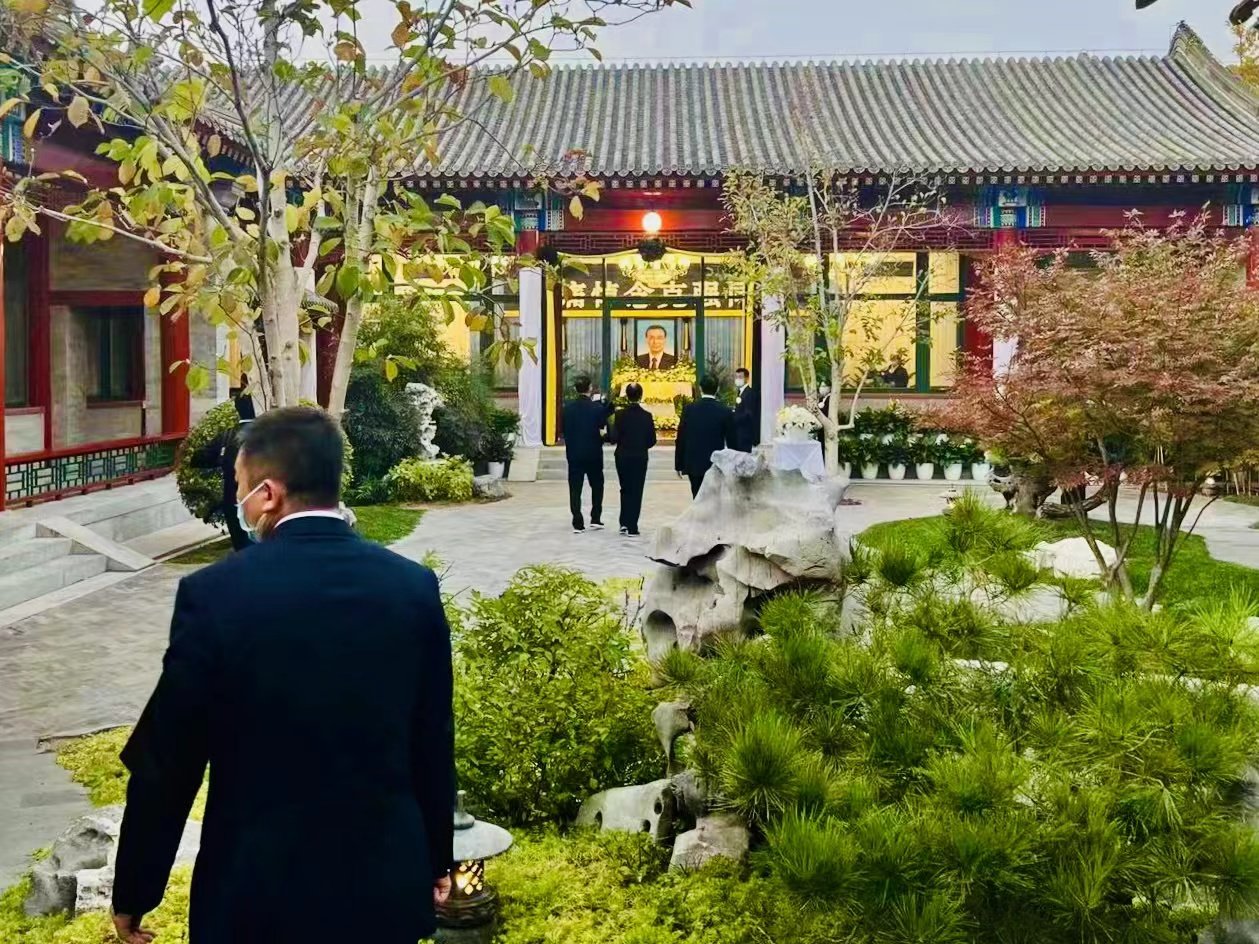 一张照片显示,李克强府邸是一个雅致的四合院,几名男子正穿越布置假山的院子,走向家中设置的灵堂。