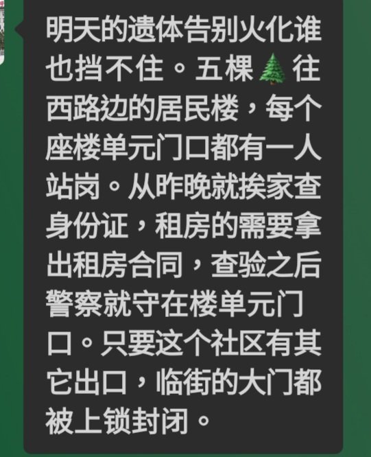 还有网友爆料,1日晚间,北京市一处居民楼每个单元门都有人站岗,当局挨家挨户查身份证。