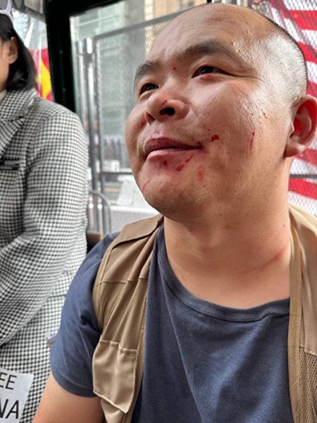 在界立建被抓的抗议活动现场,来自旧金山的抗议者李德龙也遭到中共暴徒殴打,头部严重受伤,手机也被偷。