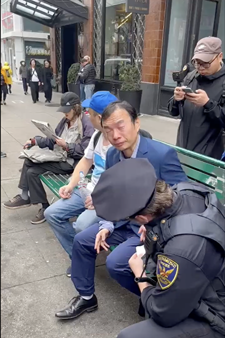 16日当天,中国民主党青年部执行长界立建在街头自卫,却被旧金山警方带走。