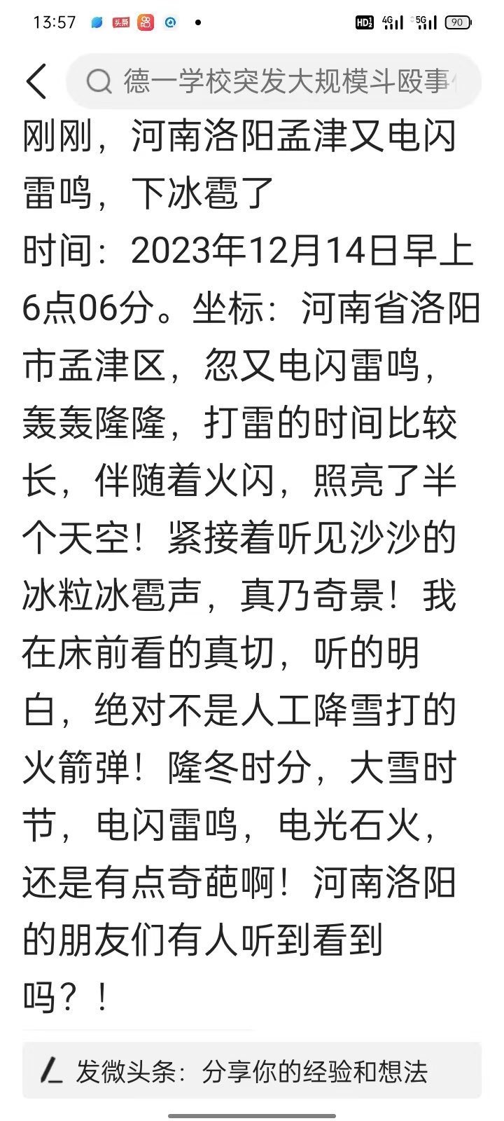 北京时间12月14日早上6时许,有当地网友爆料,洛阳市孟津区长时间电闪雷鸣,雷声隆隆,伴随着火闪,照亮了半个天空。紧接着,就听见沙沙的冰粒冰雹声,真乃奇景。