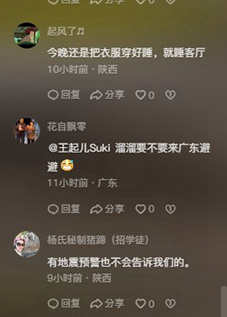 “跟地震有关吗?”“我睡觉都不敢脱衣睡”“今晚还是把衣服穿好睡,就睡客厅。”“有地震预警也不会告诉我们的。”