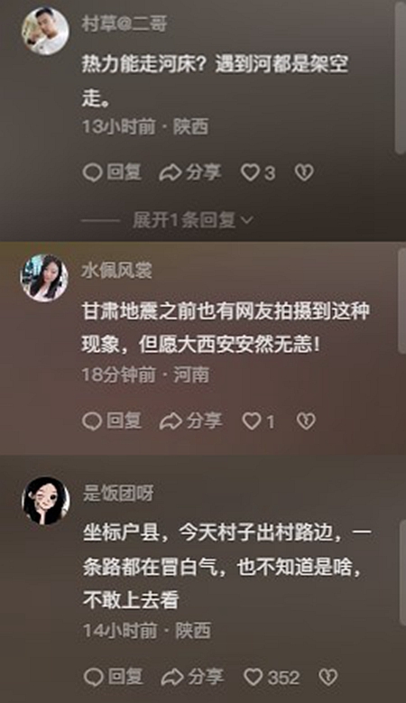 “坐标(陕西)户县,今天村子出村路边,一条路都在冒白气,也不知道是啥,不敢上去看。”