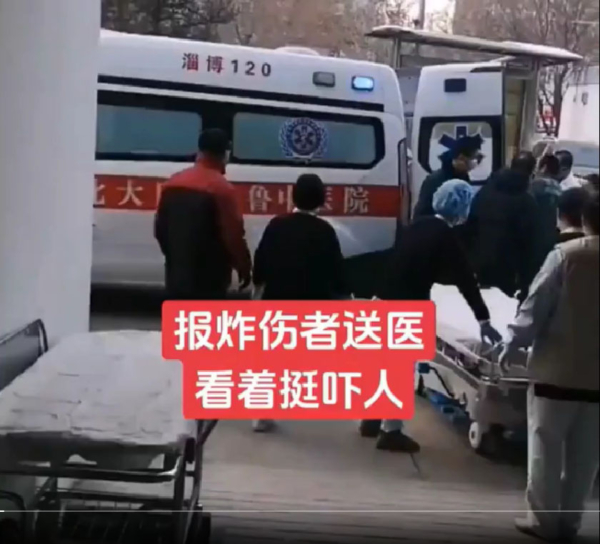 照片中救护车上的医院名字为“北大医疗鲁中医院”。公开资料显示,北大医疗鲁中医院前身为齐鲁石化公司中心医院,与发生爆炸的化工厂存在关联。