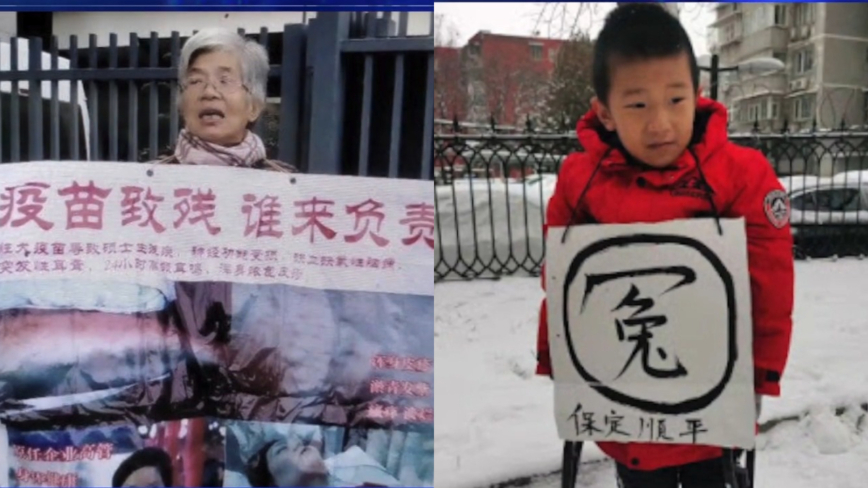 河北顺平疫苗受害儿童家长贾小玉,因替儿子维权讨公道,今年11月27日被顺平县法院以寻衅滋事罪名判刑4年。12月22日她的一双儿女,站在冰天雪地的街头为母亲喊冤。小女孩胸前挂着一块牌子,上面写着“求关注,哥哥疫苗致残,妈妈信访被判4年,保定顺平法院冤判,我为妈妈呐喊鸣冤”,小男孩子拄着拐棍,胸前挂着一个大大的“冤”字,流着泪水,喊“妈妈,我们想你”。