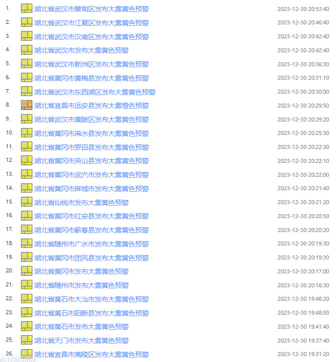 12月30日,中央气象台于18时又发布大雾黄色预警,预计12月30日夜间至31日上午,河北、河南、山东、安徽、浙江、江西、湖北、湖南、四川盆地等地的部分地区有大雾,其中,湖北南部、湖南北部、四川盆地等地的部分地区有能见度低于200米的强浓雾,局地有能见度低于50米的特强浓雾。