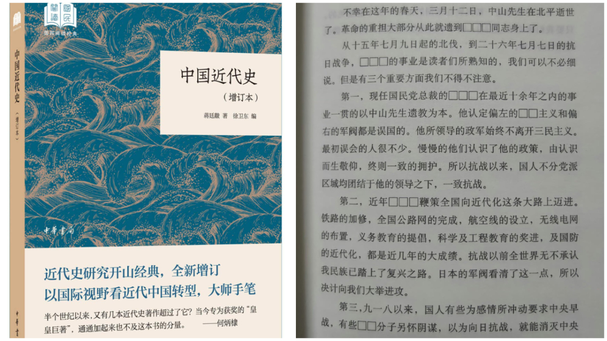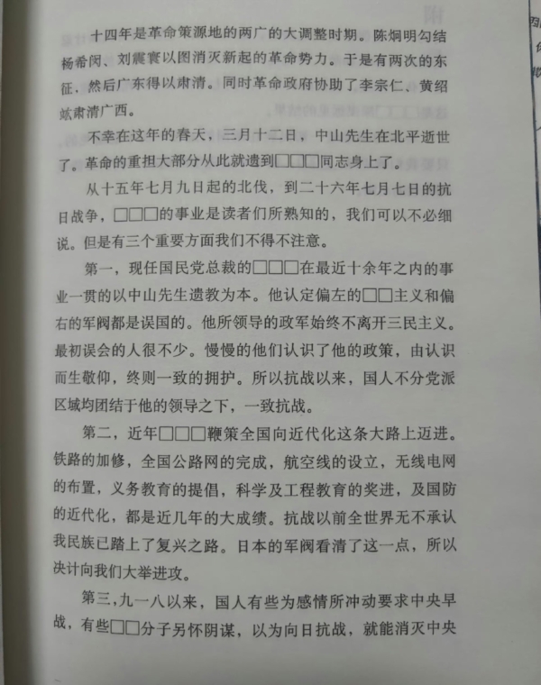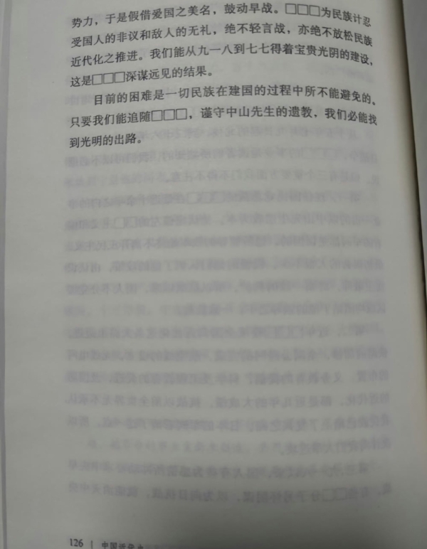 此外,此节正文“他认定偏左的共产主义和偏右的军阀都是误国的”中的“共产”二字变成“口口”,“有些反动分子”中的“反动”二字也被“口口”替换。