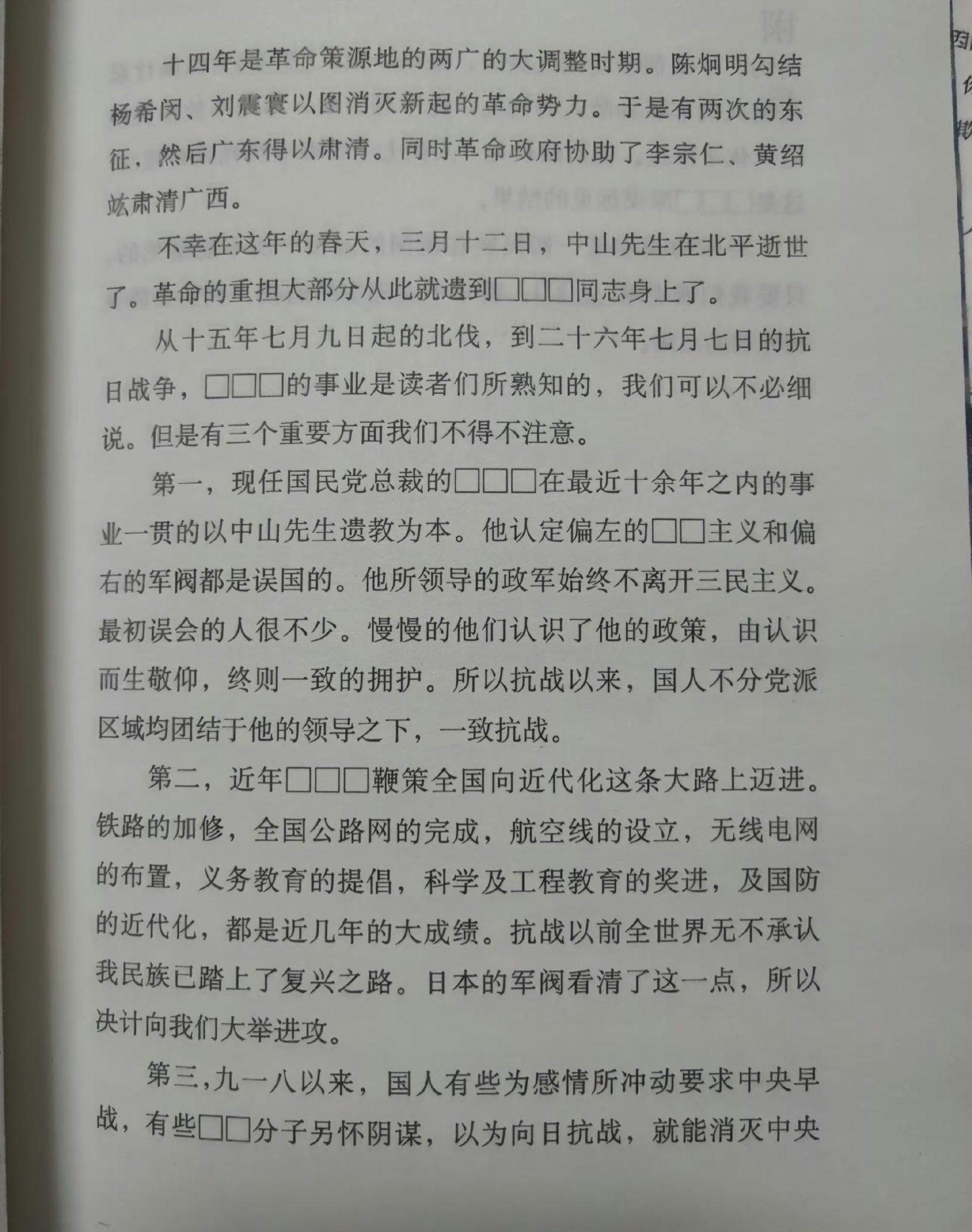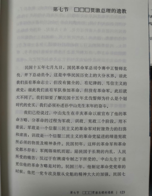 比如第四章第七节《蒋总裁贯澈总理的遗教》,文中称呼中华民国前总统蒋介石的“蒋总裁”“蒋先生”都被“口口口”代替,而第一段的“蒋中正”却原封不动。这似乎显示,这些“口口口”可能是敏感词审查的结果。