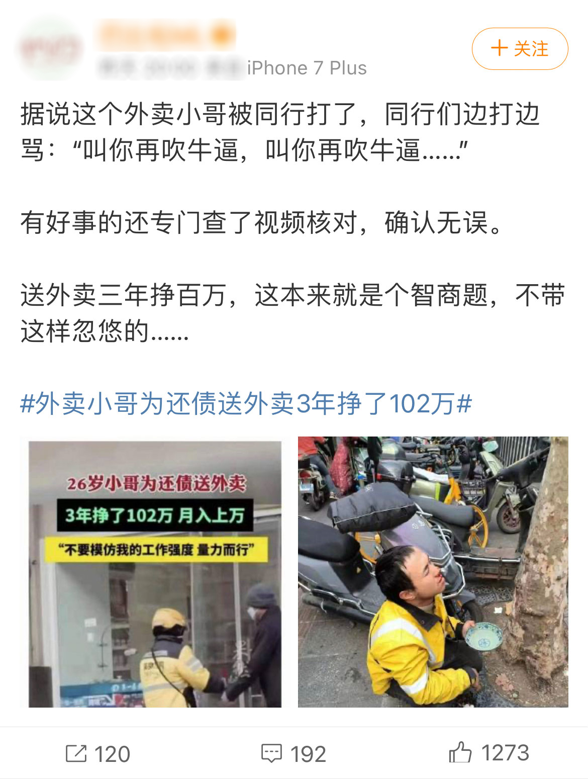 【新!唐!人:北京时间2024年01月16日讯】近日,中共官媒扎堆转发了一篇关于一位外卖小哥3年挣102万元(人民币,下同)的报导,招致大陆网友的强烈质疑。随后网上传出消息称,这名外卖员被同行打了,而当事人旋即发帖“辟谣”,引发舆论关注,而其“勤劳致富”的神话被指已破灭。