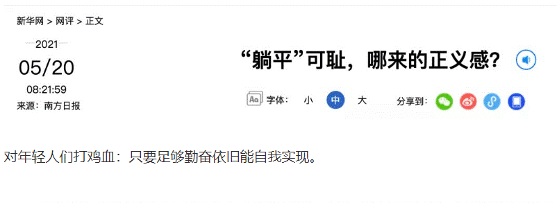 中共当局却对年轻人 “躺平”大加挞伐,中共喉舌新华网发文称,“ 躺平可耻”,还有官媒称,“认命可以,躺平就是不行”。