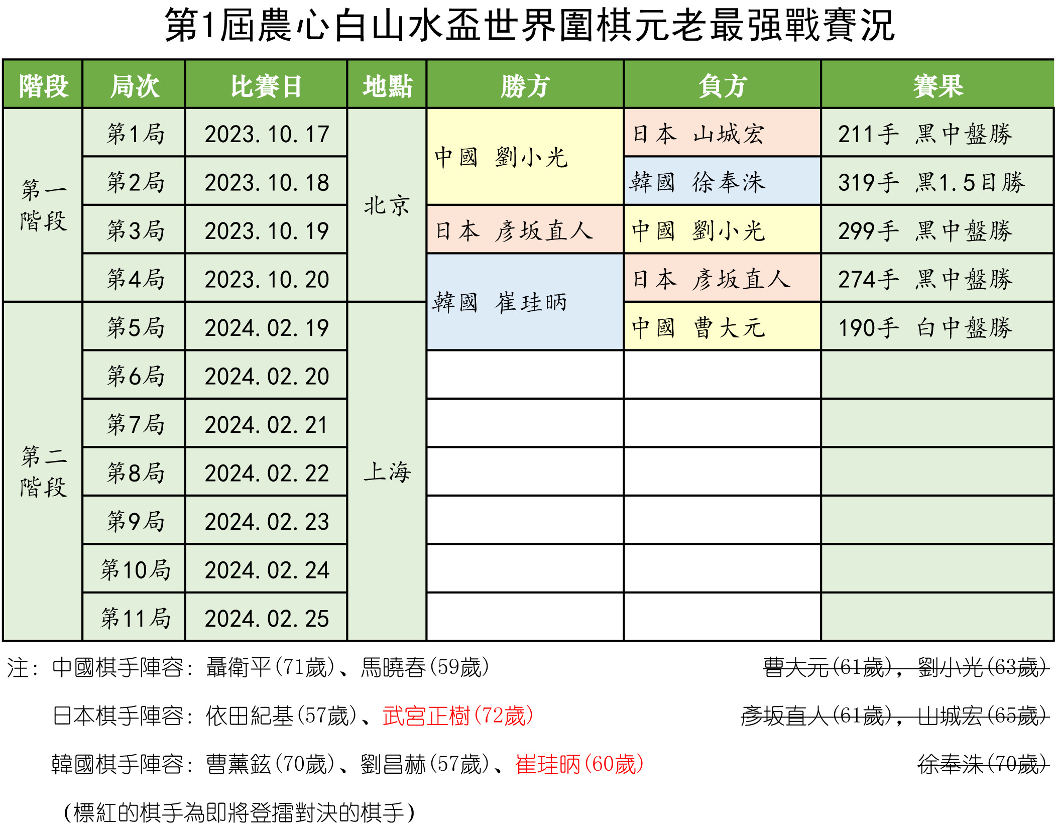 至此崔珪昞达成二连胜,请出日本元老队副帅武宫正树。此前双方没有交手记录,20日将是一场遭遇战。如果崔珪昞再胜,将拿到本届比赛的首个连胜奖;如果武宫正树获胜,韩日中三国将均只剩主副帅二人,又回到同一起跑线。