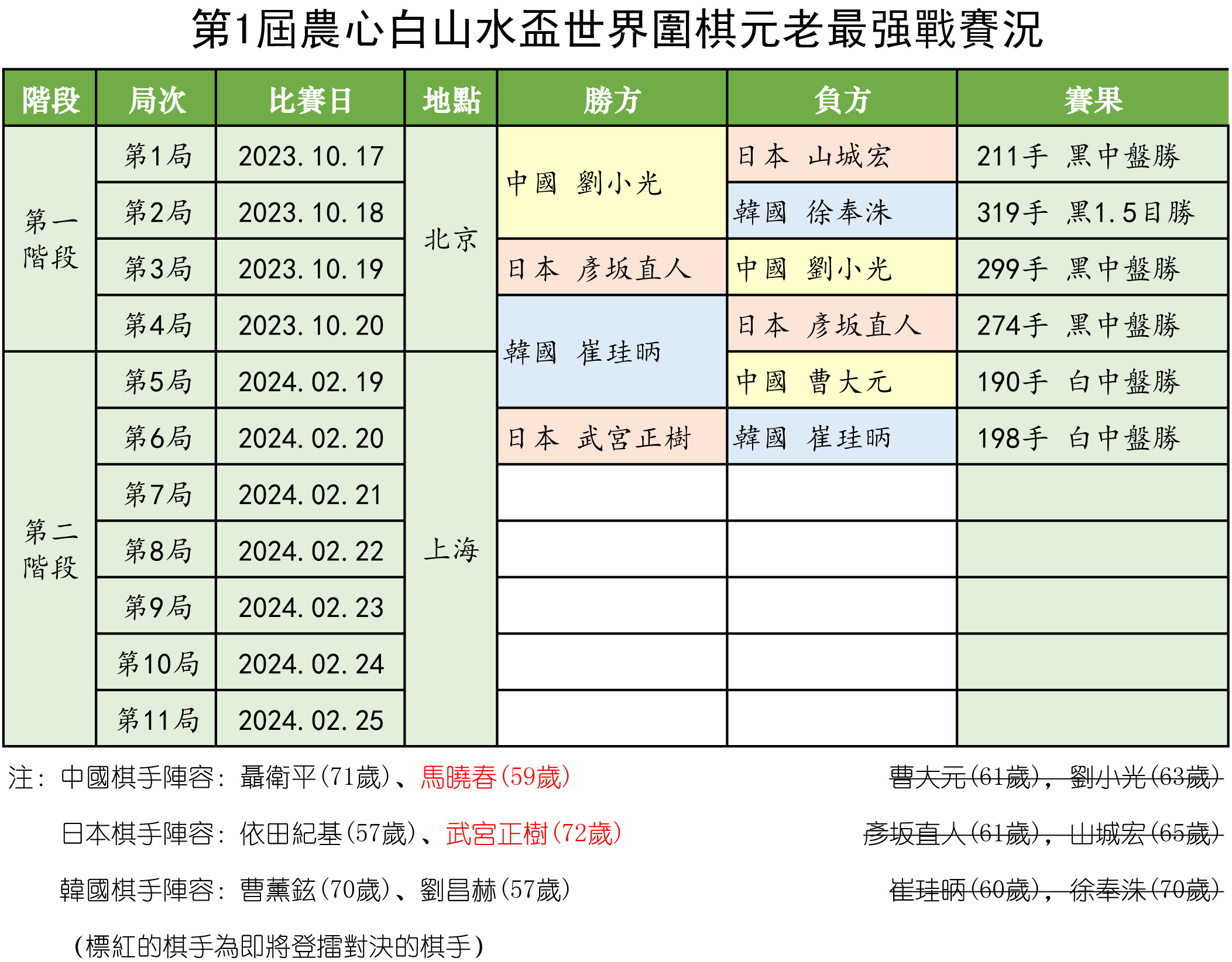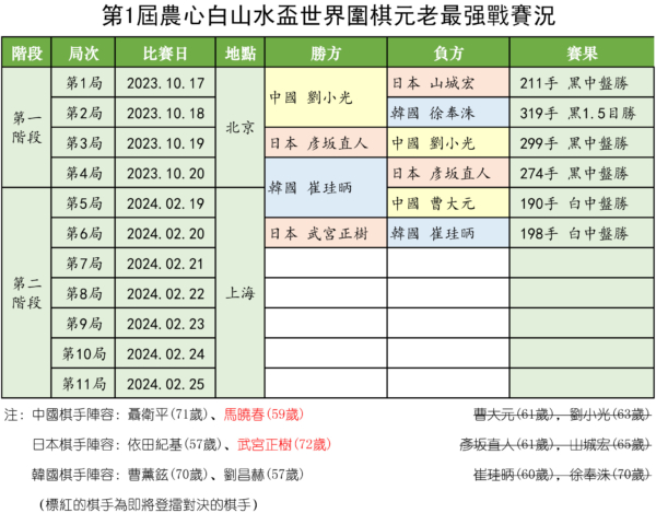 此次元老赛,武宫正树以72岁高龄成为参赛棋手中最年长者。在山城宏和彦坂直人被打下擂台之际披挂上阵,与比自己小一轮的崔珪昞交手。此前二人尚无对战记录。