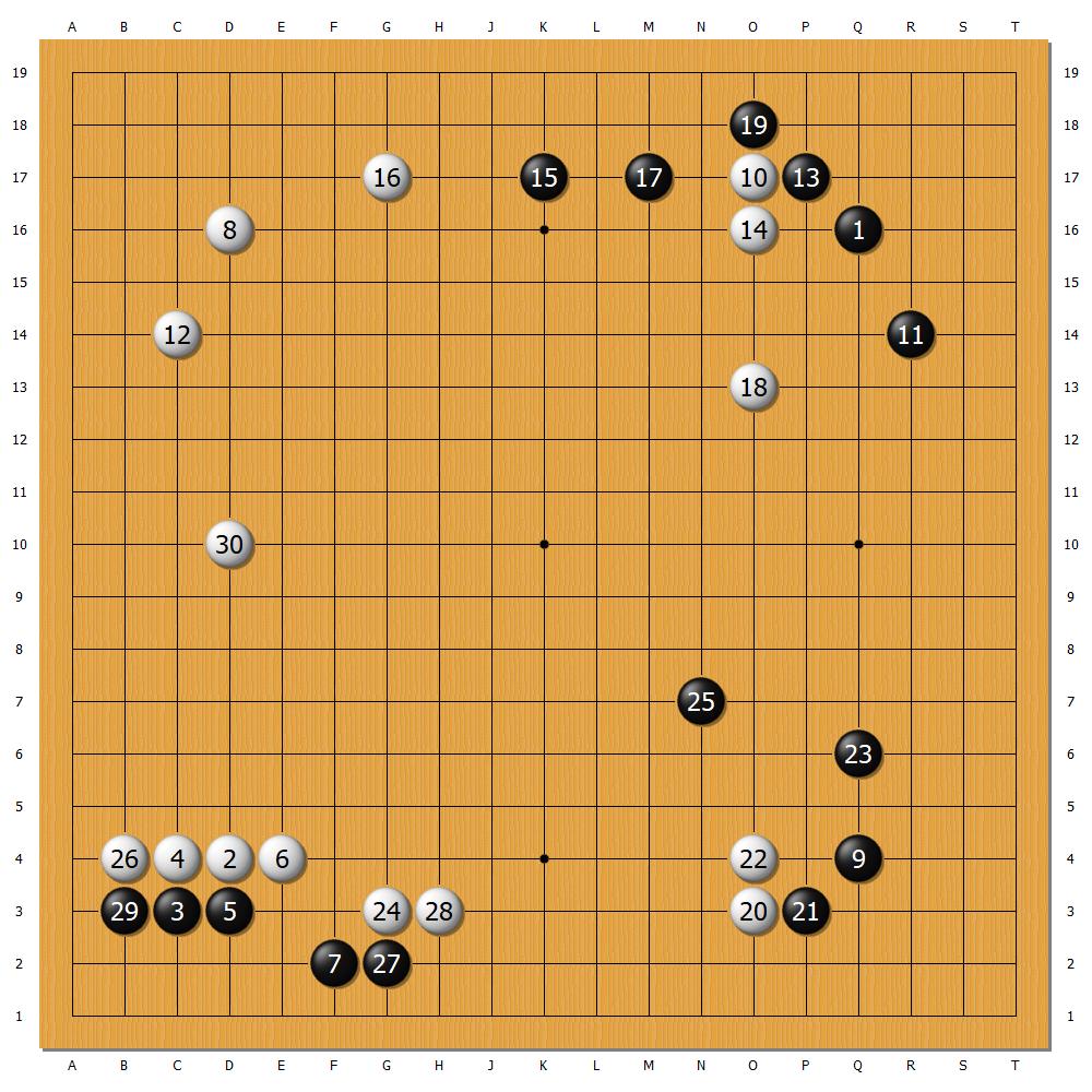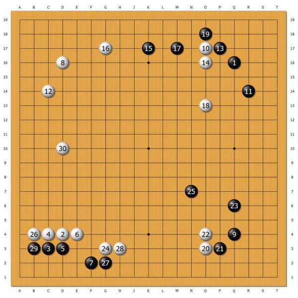经过猜先,崔珪昞执黑先行。本局,崔珪昞似乎想领教“宇宙流”的厉害,有意促白棋成势。有趣的是,殊不知在赛前新闻发布会上,武宫正树作为嘉宾受访时曾讲:“我很喜欢AI(人工智能)下的棋,除了一开始点三三的布局不太喜欢,其它都挺喜欢的。”,本局崔珪昞第3手就点“三三”,颇有点“哪壶不开提哪壶”的感觉。