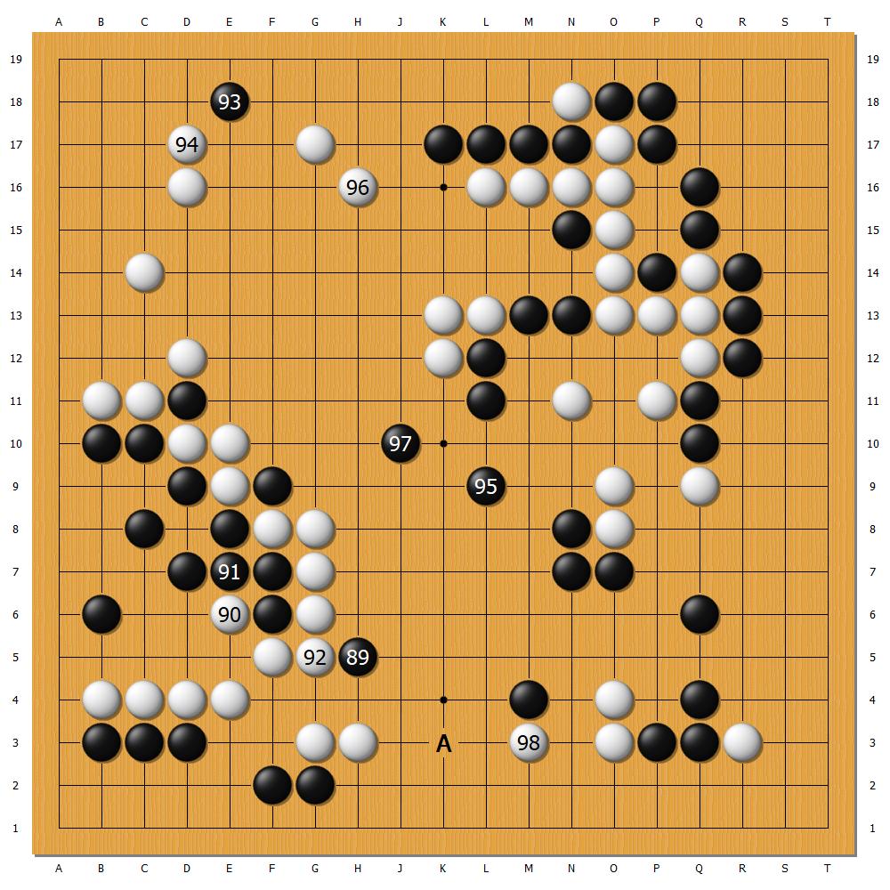 中盘阶段,黑棋在攻击右下白二子时,屡屡错失人工智能给出的A位选点(如下图),围住下边成空。直至第98手,白棋先下手为强,将二子救出,黑棋实空已略显不足。