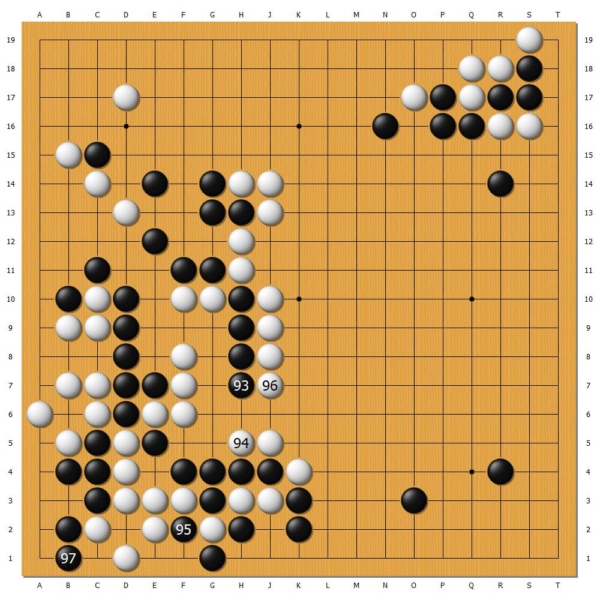 依据人工智能判断,黑95手选择吃住白左下角,而放弃中间四子,是得不偿失。而白96手笑纳大礼,吃住对手棋筋,胜率超过九成。