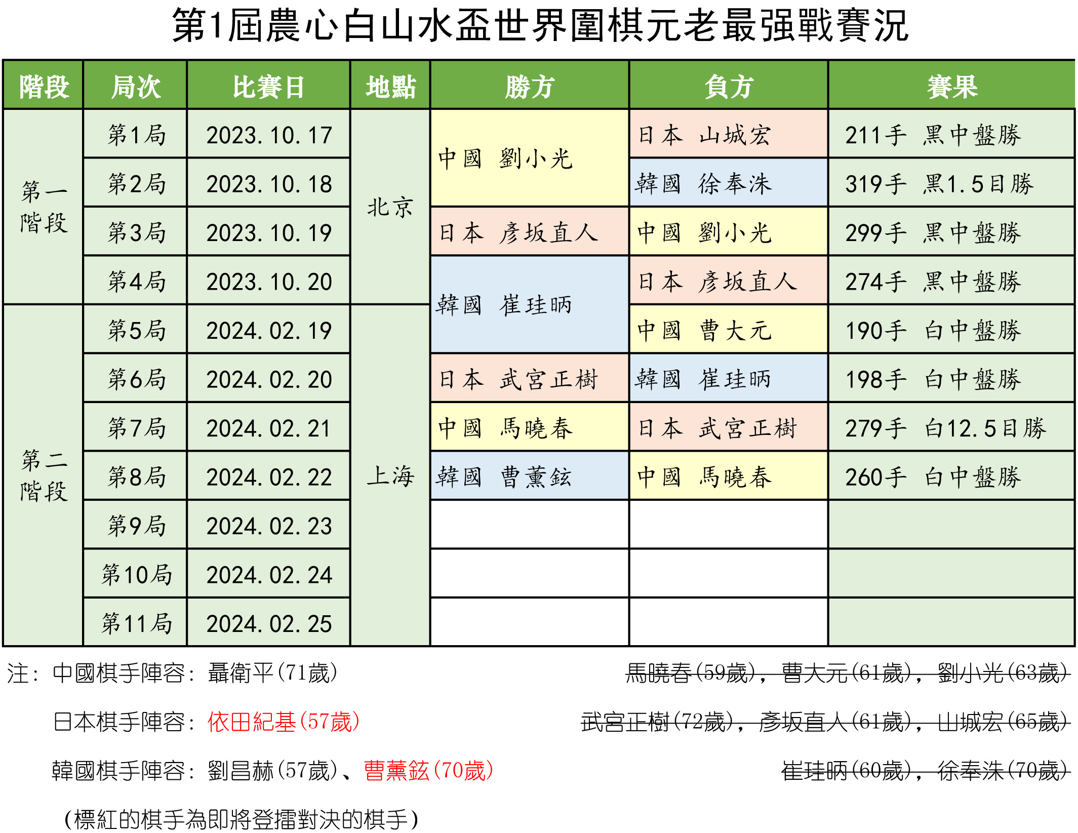 【新!唐!人:北京时间2024年02月23日讯】2月22日,首届“农心白山水杯世界围棋元老最强战”在上海大酒店进行得如火如荼,韩国队副帅曹薰铉九段宝刀不老,把中国队副帅马晓春九段赶下擂台,23日将迎接日本队主帅依田纪基九段的挑战。