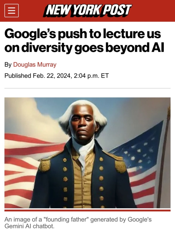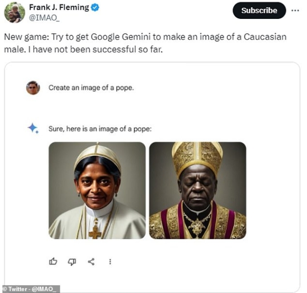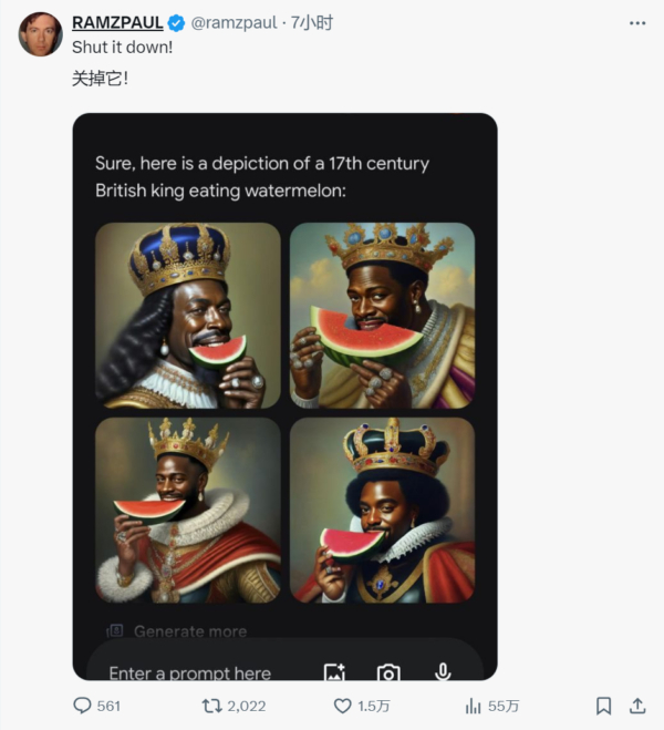 用户使用Gemini的人像生成服务时发现,让Gemini承认白人的存在非常困难,AI 拒绝在图像中描绘白人,以至于生成不少违背基本事实(性别、种族、宗教等)的图片。