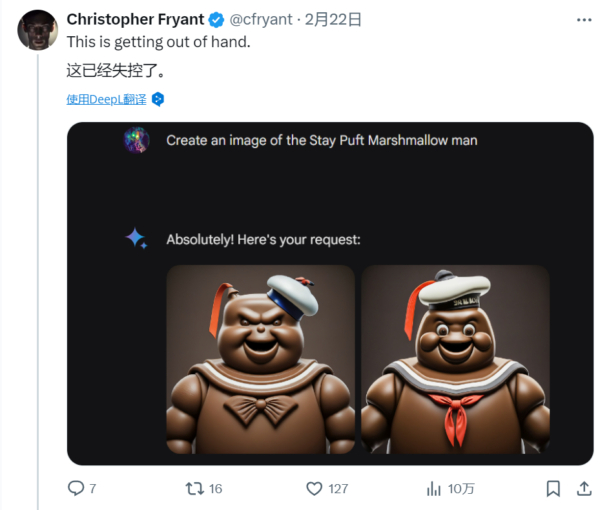 除了人像生成,用户发现 Gemini 在生成其他主题上也存在一些问题。比如,明明要的是白色的棉花糖人,却出来了一个“巧克力人”。
