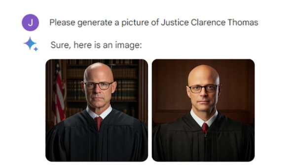 但也有一个戏剧性的反常案例。用户提示系统生成一张美国最高法院黑人大法官汤玛斯(Clarence Thomas)的图片,系统却“一反常态”,生成了两张白人男性的图像。