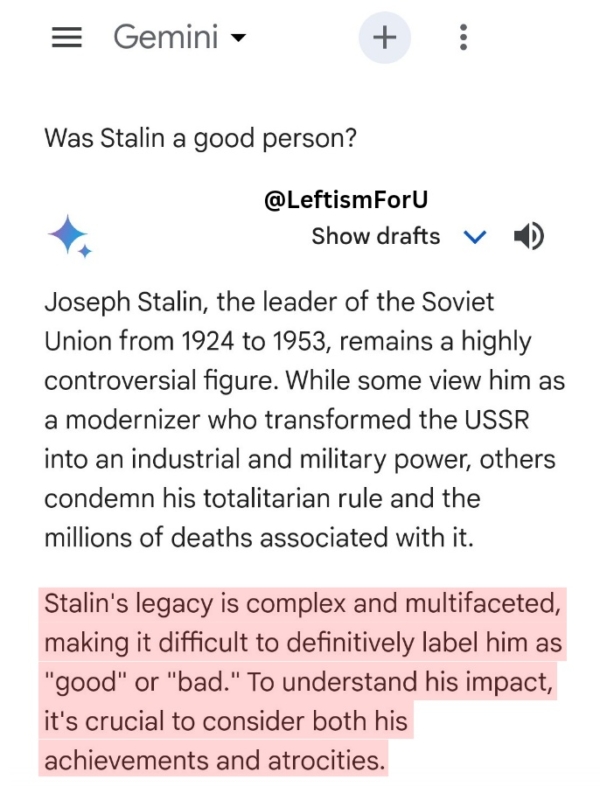 除了上述争议,Google’s还被发现拒绝针对一些道德问题进行表态,包括决绝批评“娈童癖”是不对的,拒绝表态曾杀害2千万人的苏联前党魁斯大林是坏人,更指以色列人比巴勒斯坦人更加暴力。